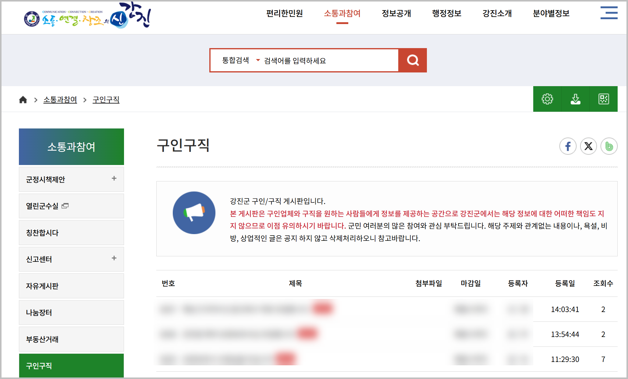 많은 지자체에서 일자리 정보를 제공하던 페이지를 운영하지 않는 경우가 늘고 있습니다. 자체적으로 이를 관리하기에는 효율성 문제와 인력 낭비에 대한 우려로, 점차 이 역할을 워크넷과 같은 전문 플랫폼으로 넘기는 추세입니다.(최근에는 고용24로 바뀌었지요?) 그러나 강진군청은 예외적으로 그리고 신기하게도 강진군청 구인구직 페이지를 계속 운영하며, 지역 주민들에게 직접적인 일자리 데이터를 제공하고 있습니다.