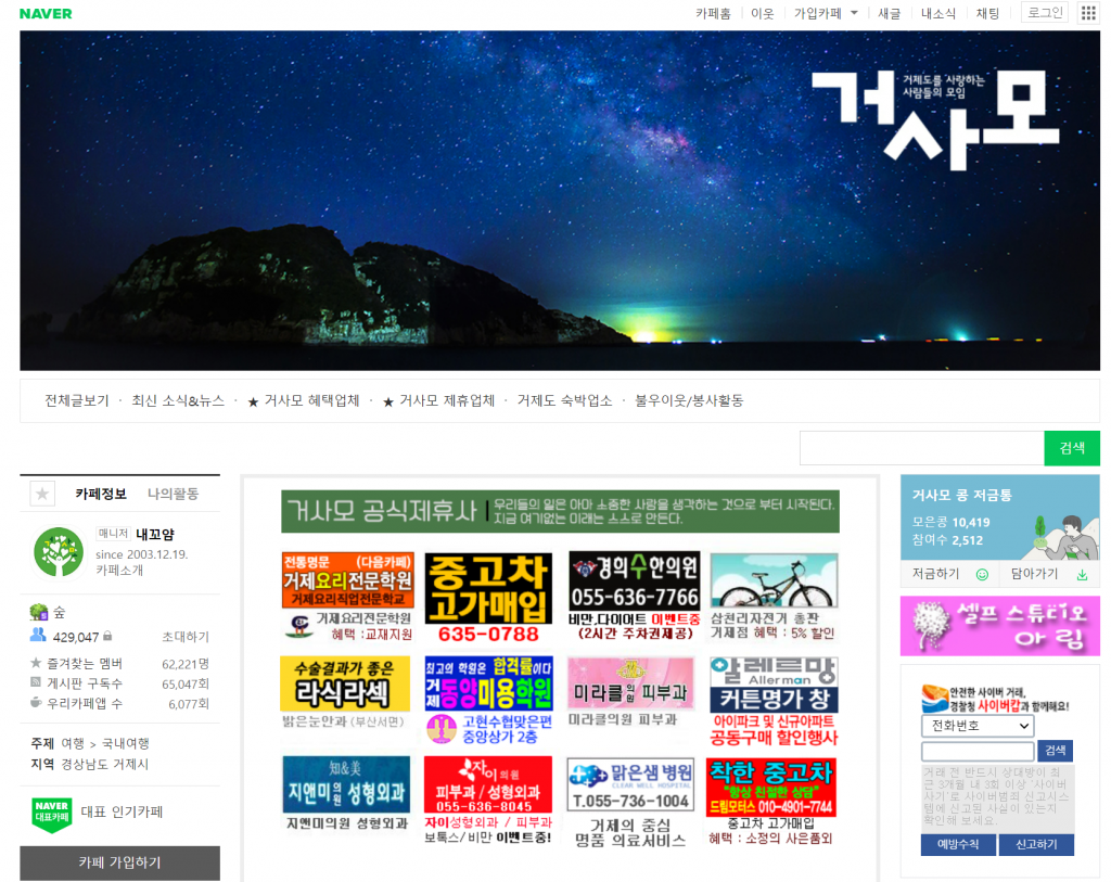 거사모는 2003년 12월 19일에 만들어진 오래된 카페입니다. 15년 이상의 운영 기간 동안 회원수는 42만 명에 육박하는 어마어마한 까페로 성장하였습니다. 섬의 총 인구가 지금 30만명 정도라고 알려져 있는데 주민보다 더 많은 분들이 가입해 있네요.