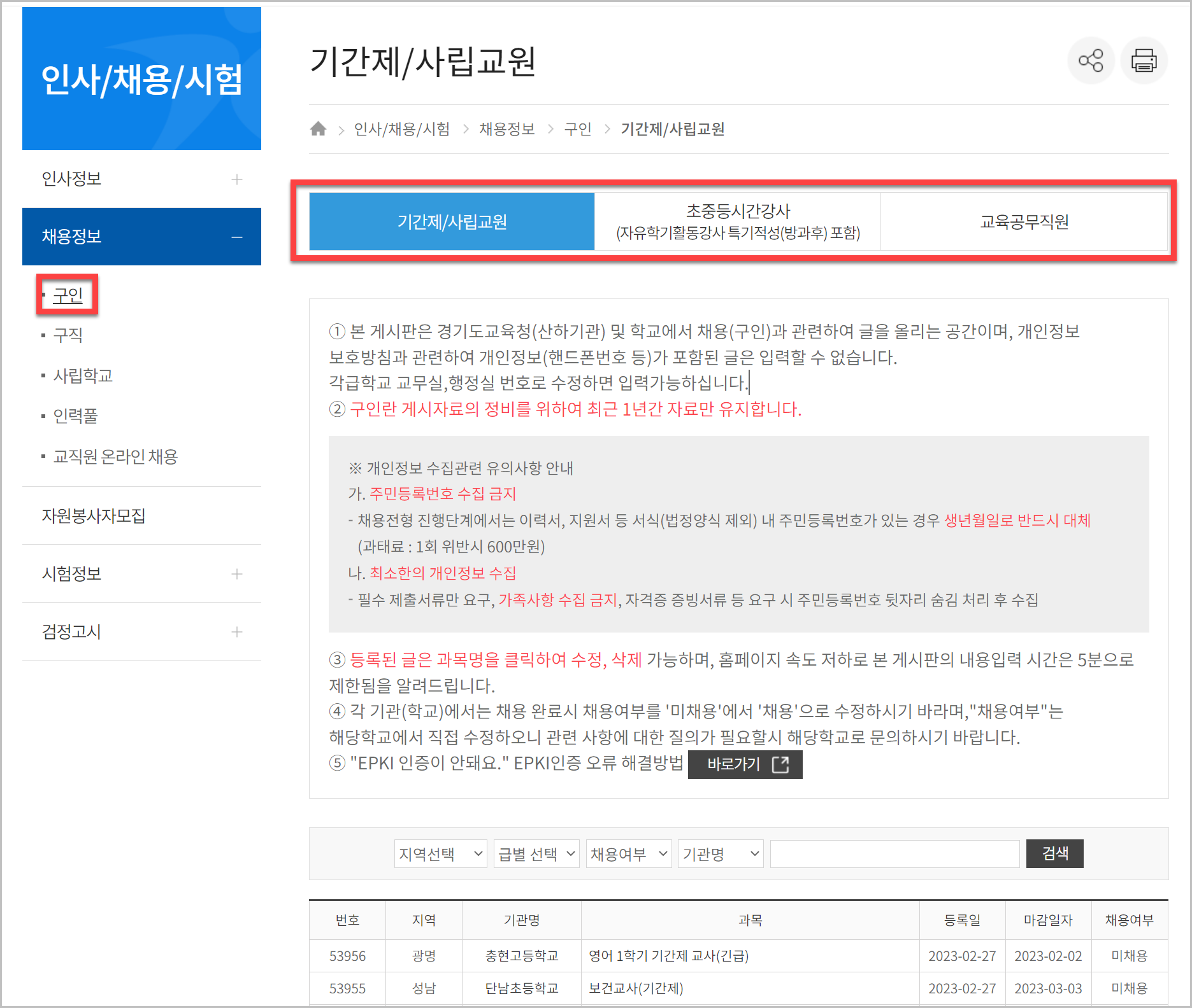 참고로 이 게시판은 경기도 교육청 및 학교에서 채용과 관련한 내용을 올리는 게시판이라고 보시면 됩니다. 그리고 이곳에는 개인정보와 관련한 내용을 올려서는 안됩니다. 만약 올렸다면 수정을 하여야 합니다. 만약 채용이 완료가 된 경우에는 채용으로 빠르게 수정을 바란다고 합니다.