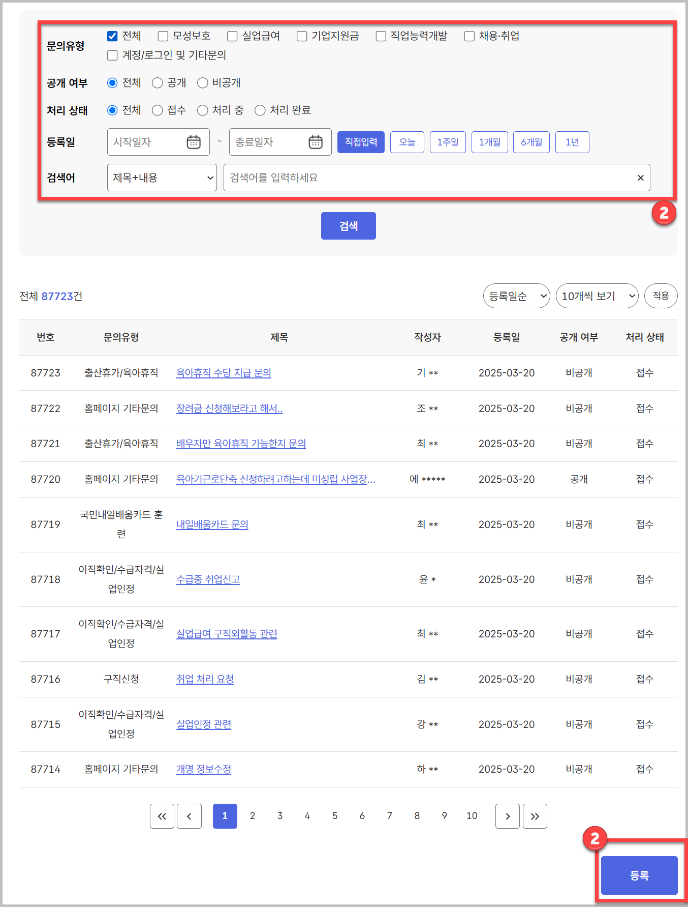 들어가면 위와 같은 화면이 나옵니다. 여기에서 먼저 검색부터 해보시고, 오른쪽 맨 아래에 있는 등록을 눌러서 질문을 진행하면 됩니다. 실명제는 아니라서 그냥 등록하면 되더라고요.