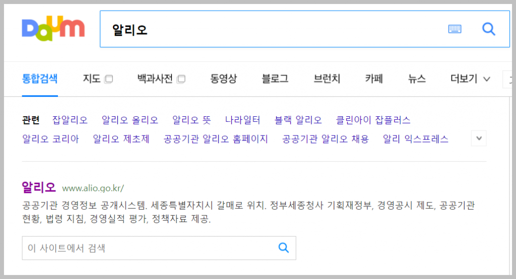 ALIO 사이트에 진입하려면 네이버나 다음과 같은 대형 포탈을 경유해서 들어가는 것이 편리합니다. 예를 들면, 다음에서 "알리오"라고 검색하면 해당 사이트로 간편하게 접속할 수 있습니다.