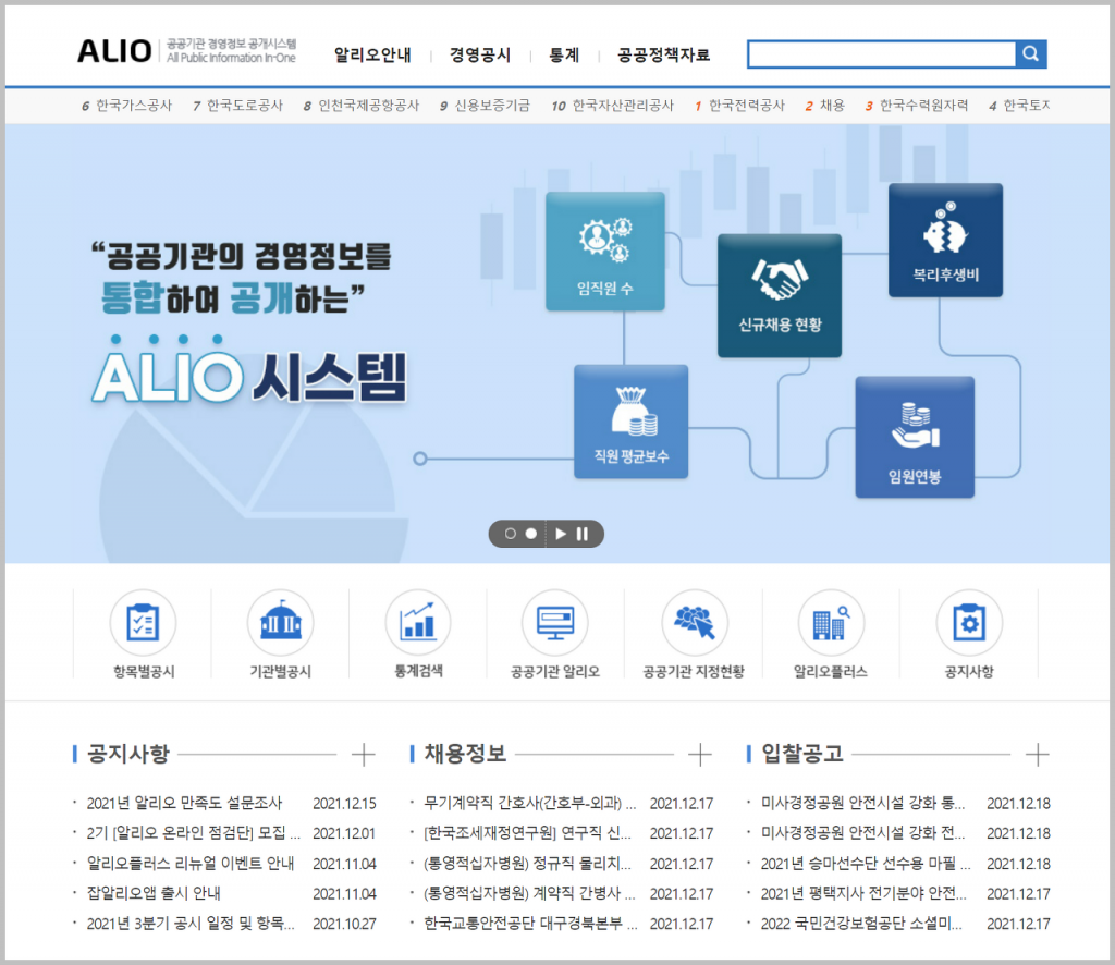 그러나 많은 사람들이 ALIO 홈페이지를 방문하는 주된 이유는 공공기관 채용 준비를 하기 위함입니다. 이 사이트는 신규 채용 정보부터 기업별 연봉 정보, 복리후생 혜택 등을 모두 제공해주므로 공기업 취업을 준비하는 분들에게는 필수로 알고있어야할 곳으로 꼽힙니다.