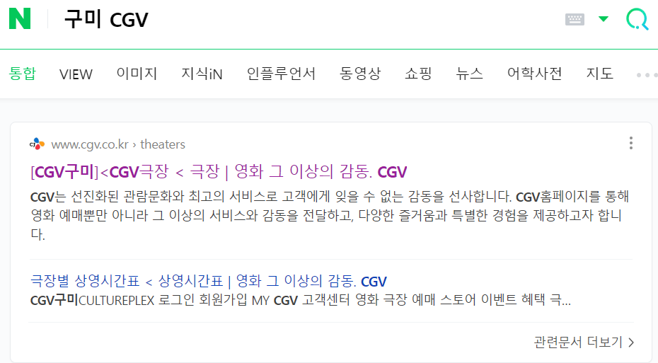 대부분의 분들이 위의 사진처럼 검색하셨으리라 생각됩니다. 지역명 + CGV 라고 검색하면 보통 상영시간표와 함께 정보가 뜨는데 '구미 CGV'의 경우 나오지 않는 것 같습니다. 몇몇곳이 그런것 같아요. 이런 경우에는 어쩔 수 없이 홈페이지에 방문하는 수밖에 없는것 같습니다.