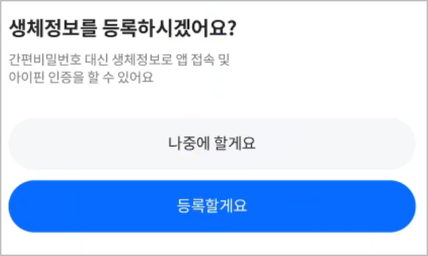 이후, 생체 인증을 설정할지 묻는 화면이 나타납니다. 지문이나 얼굴 인식을 통한 생체 인증을 사용하면 더 안전하게 아이핀을 사용할 수 있으므로, 설정하는 것을 권장드립니다. 생체 인증을 설정하지 않더라도 이후에 추가할 수 있습니다.