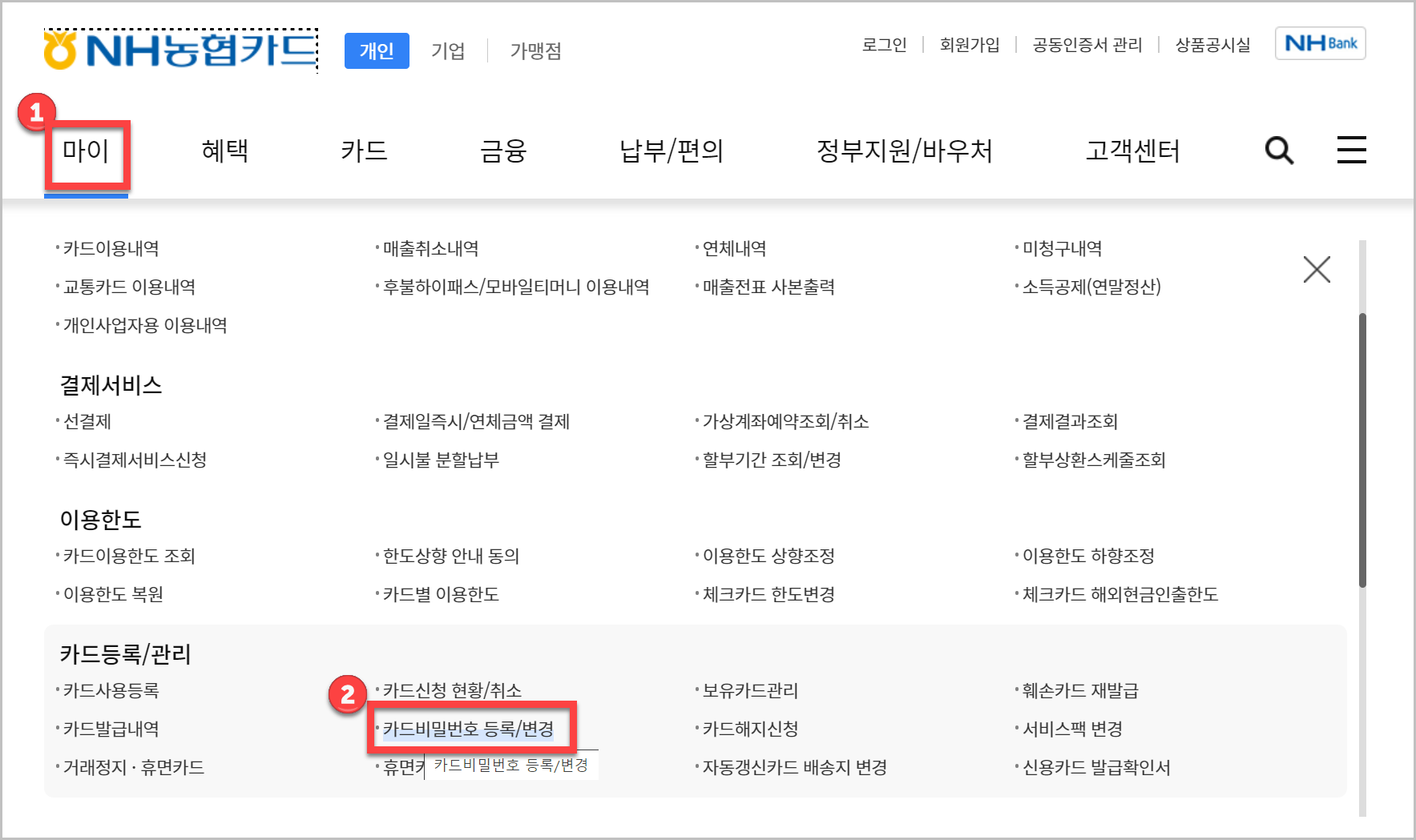 1) 마이 > 카드비밀번호 등록/변경