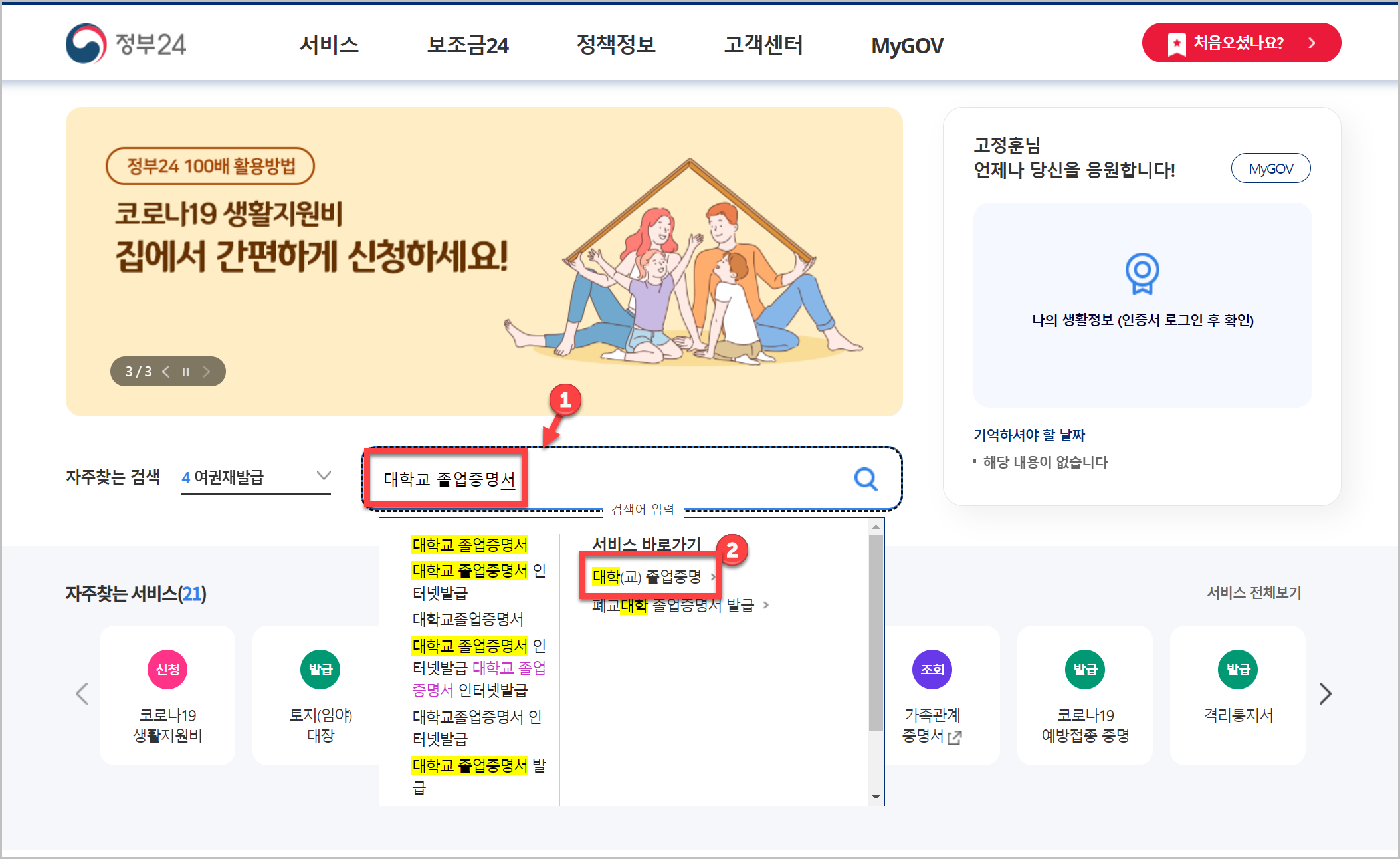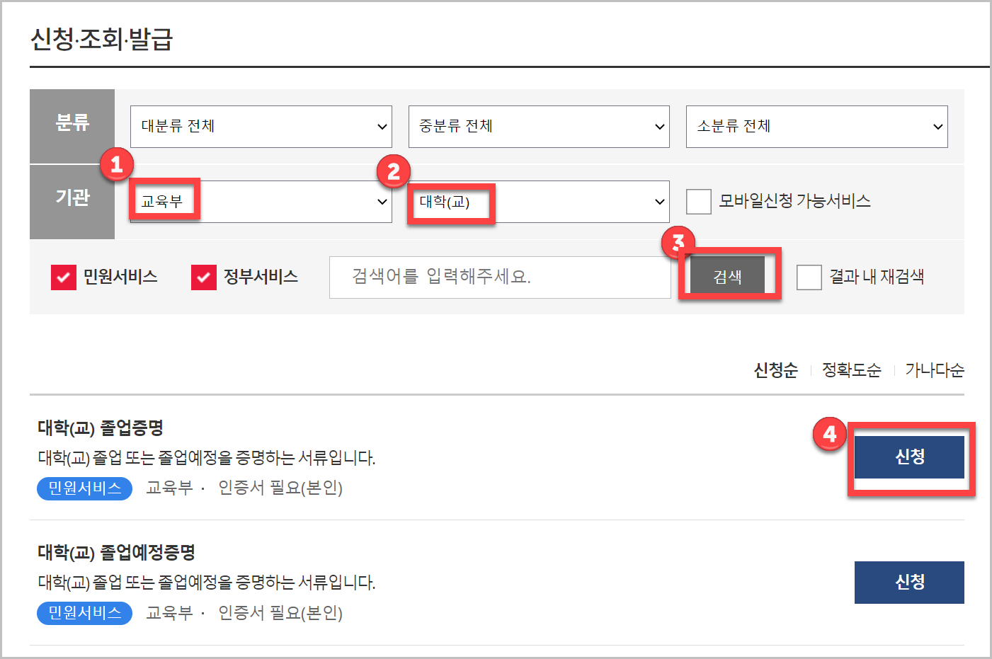 그리고 위와 같은 화면에서 1) 교육부 2) 대학교 3) 검색을 클릭을 하시면 우리가 원하는 대학졸업증명서 인터넷발급이 가능한 것이 나오게 됩니다. 만약 이러한 방식이 되지 않는다면 (가끔 문제를 일으키곤 합니다.) 아래처럼 검색을 하시면 됩니다.