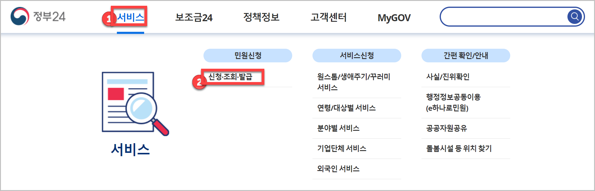 우리는 위와 같은 화면이 나오게 되면, 1) 서비스 2) 신청 으로 들어가시면 다양한 민원을 검색할 수 있는 페이지로 들어가실 수 있습니다.