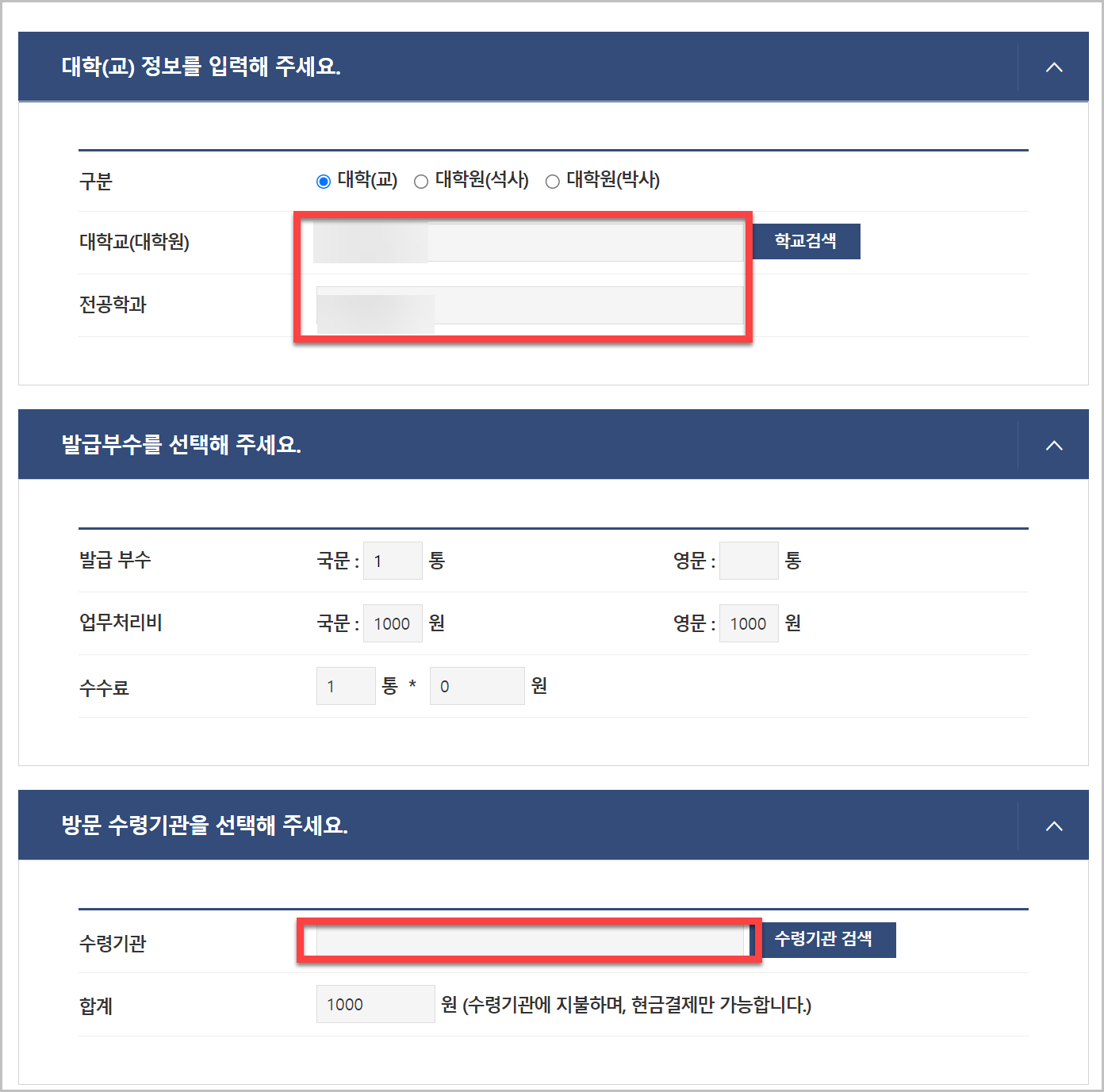 인증을 하고나면 위와 같이 학교 이름과 전공학과, 그리고 인근 수령기관을 검색을 하시면 됩니다. 제가 알기에는 3시간 이내에 해당 문서가 동사무소에 도착한다고 알고 있습니다.