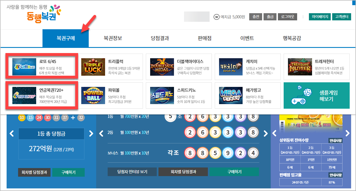 5) 구매를 누르면 여러가지 상품이 나오는데 가장 많이 이용하는것은 역시 로또와 연금복권입니다.