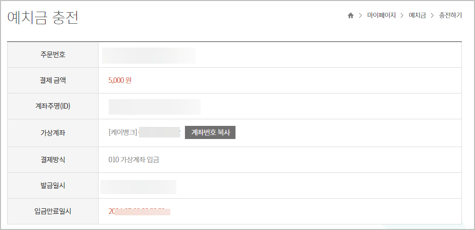 4) 충전방법은 케이뱅크 간편충전이 좋지만, 가상계좌 입금도 가능합니다. 최저입금은 5000원 입니다.