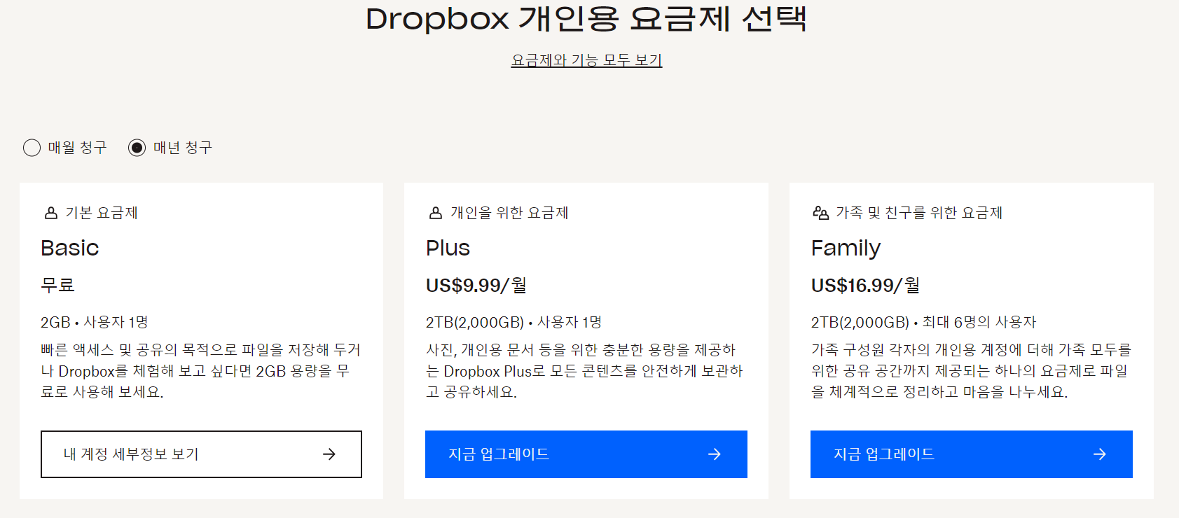 이 서비스의 유일한 단점이라고 한다면, 요금제 입니다. 당연히 기본요금제가 존재 하기는 하지만 유료 요금제로 가기 시작하면 와 만만치 않습니다. 우리나라돈으로 13000원에 2테라 입니다. 비싸기로 유명한 아이클라우드가 2테라에 만천원인것을 생각하면 한숨나오는 가격이지요.