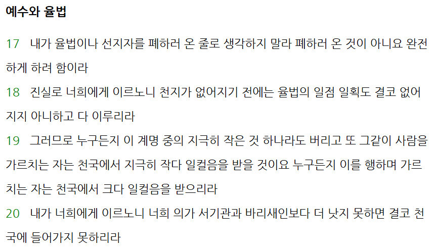 예수님이 오신 목적은 율법을 폐하려는 것이 아니라 완전하게 하려 함임을 명시하십니다. 바리새인이나 서기관보다 더 나은 의를 가져야 천국에 들어갈 수 있다고 강조하십니다.
