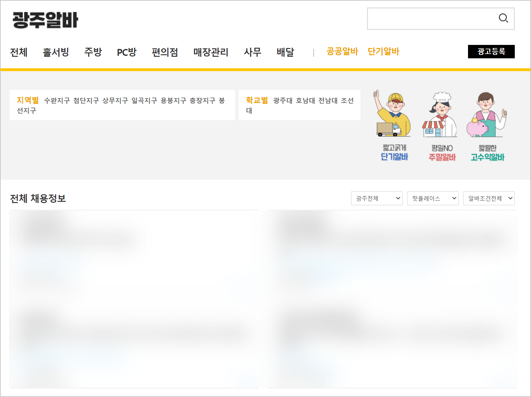 흥미로운 점은 이 사이트는 알바 구인구직 정보를 별도로 제공하는 '광주알바'라는 사이트를 운영하고 있다는 것입니다. 이 사이트는 공식 홈페이지에 비해 상대적으로 적은 정보를 제공하지만, 1829 세대에게 적합한 단기 일용직 정보가 많이 올라와 있습니다. 따라서 알바를 구하는 사람들에게 유용한 사이트입니다.