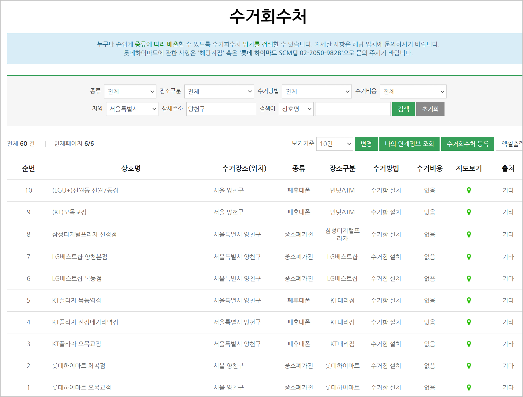 위와 같이 나오게 됩니다. 보시면 알겠지만, 대부분 통신사 영업점 대리점에서는 폐휴대폰 수거를 하고, 중소폐가전은 삼성전자 또는 LG대리점에서 취급을 하고 있습니다. 이를 확인을 하고 접근을 하시면 좋을것 같아요.