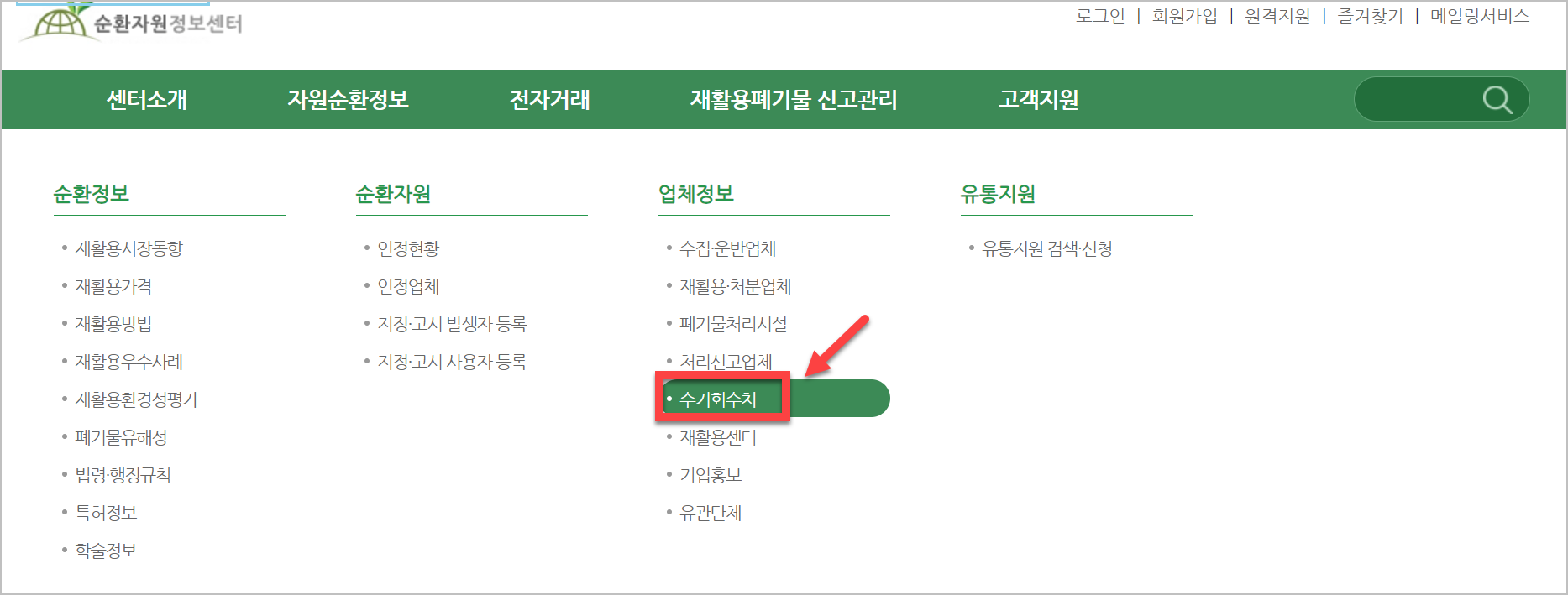 - 상단 메뉴에서 '자원순환정보'를 클릭한 후, 하위 메뉴에서 '수거회수처를 선택합니다.
