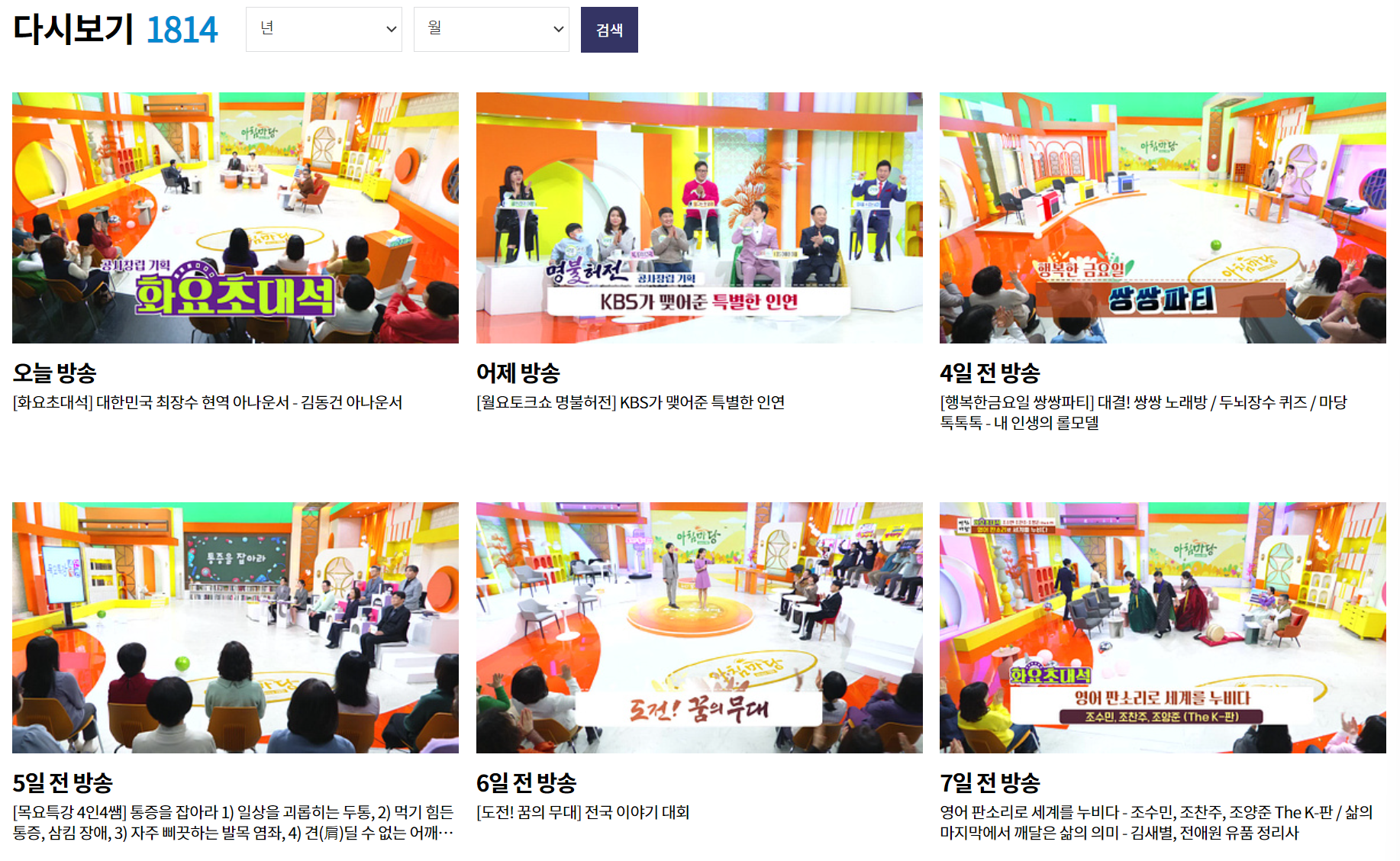 지난 방송을 보는 시스템도 잘 갖춰져 있습니다. KBS는 국가에서 제공하는 방송이고, TV수신료를 내는 방송이기 때문에 무료로 다시보기를 할수 있습니다.