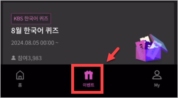 또는 아래 그림처럼 하단 메뉴에 있는 '이벤트'를 터치해도 됩니다. 여러가지 방법이 있으니 조금만 어플을 뒤져보면 쉽게 참여하실수 있습니다.