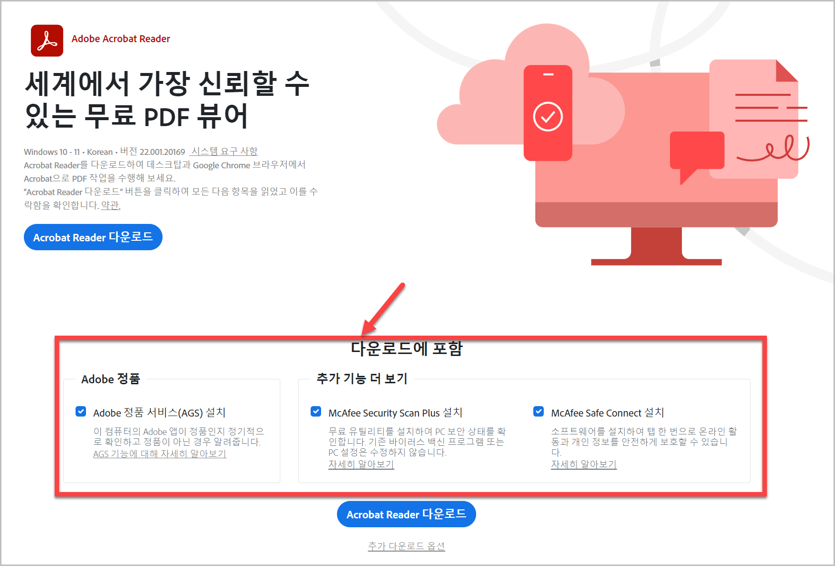 위 링크로 들어가시면 간단하게 아크로벳리더 다운로드 페이지로 들어가실 수 있습니다. 하지만 잘 살펴보고 다운로드를 해야합니다.