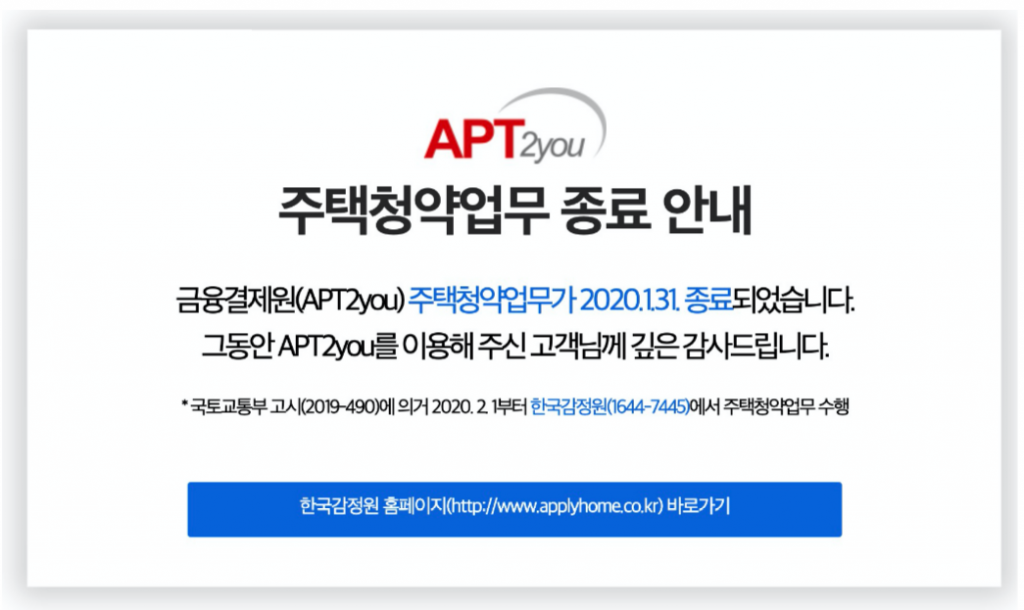 그러나 어떤 이유로 APT2you 는 더 이상 운영되지 않습니다. 현재는 한국감정원을 활용해야 합니다. 이에 따라 APT2you 에서의 신청 방법을 익힐 필요가 없어진 것이죠. 안내문을 살펴보면 2020.1.31일을 기준으로 업무가 끝났다고 합니다.