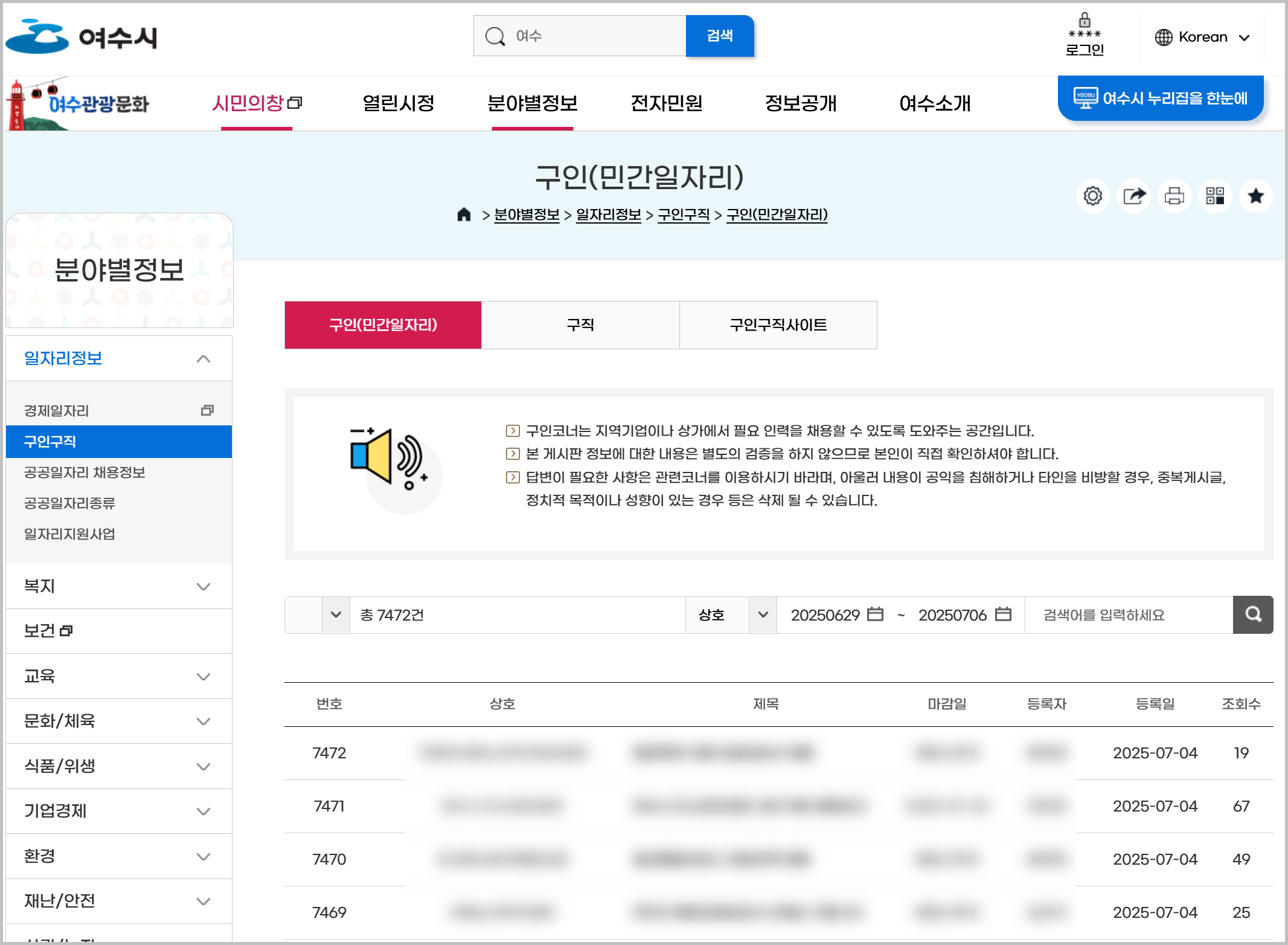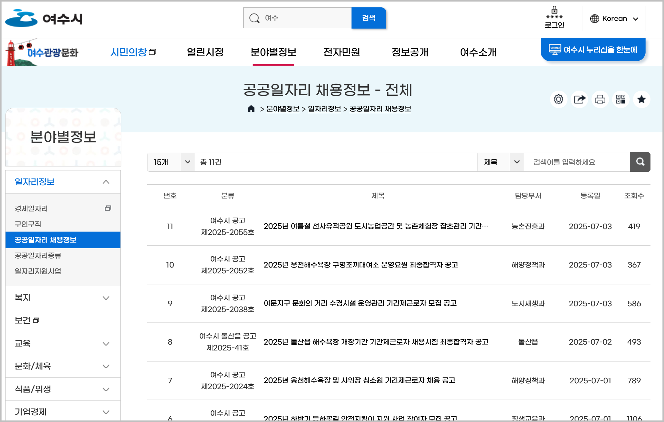 이번 포스팅에서는 여수시청 구인구직 게시판에 대한것 입니다.