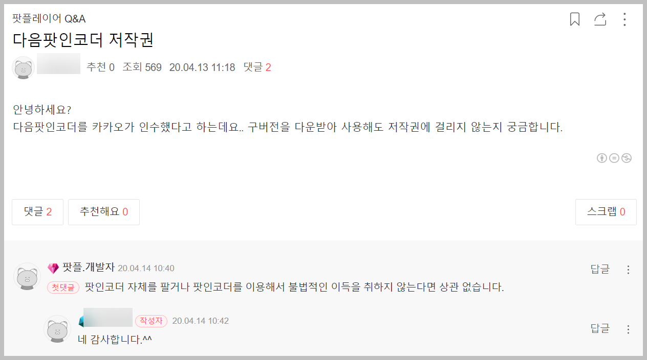 그리고 이를 이용하는것도 딱히 문제가 되지 않는다고 합니다. 팟인코더 자체를 팔거나 불법적 이득을 취하지 않는다면 아무런 문제가 없다고 합니다. 그러니까 마음 편하게 이용을 하시면 됩니다.