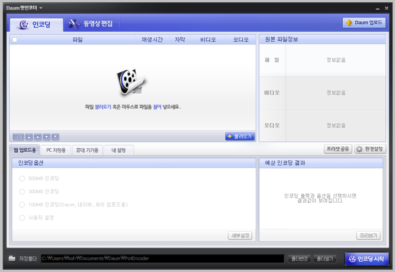 그러면 위와같이 다음팟 인코더가 설치가 완료가됩니다. 그리고 이렇게 실행이 됩니다. 오랜만에 보는 팟인코더네요. 굉장히 사용을하기 편리하고 가벼웠던 기억이 납니다. 하지만 이제 이것도 구시대의 산물이되어버렸습니다. 요즘에는 스마트폰도 훌륭히 동영상편집을 할수있기 떄문에 이런 프로그램이 많이 필요 없게 된것 같아요.