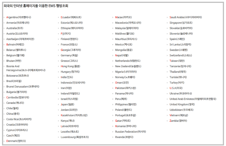 위 링크로 이동하면 '인터넷 행방 조회' 사이트로 이동합니다. 이 사이트를 통해 미국, 일본 등 주요 선진 국으로 발송된 EMS의 배달 상태를 직접 인터넷을 통해 확인할 수 있습니다. 그러나 모든 나라에서 조회가 가능한 것은 아닙니다. 현재로서는 전 세계 90여 개 국가에서만 가능합니다.