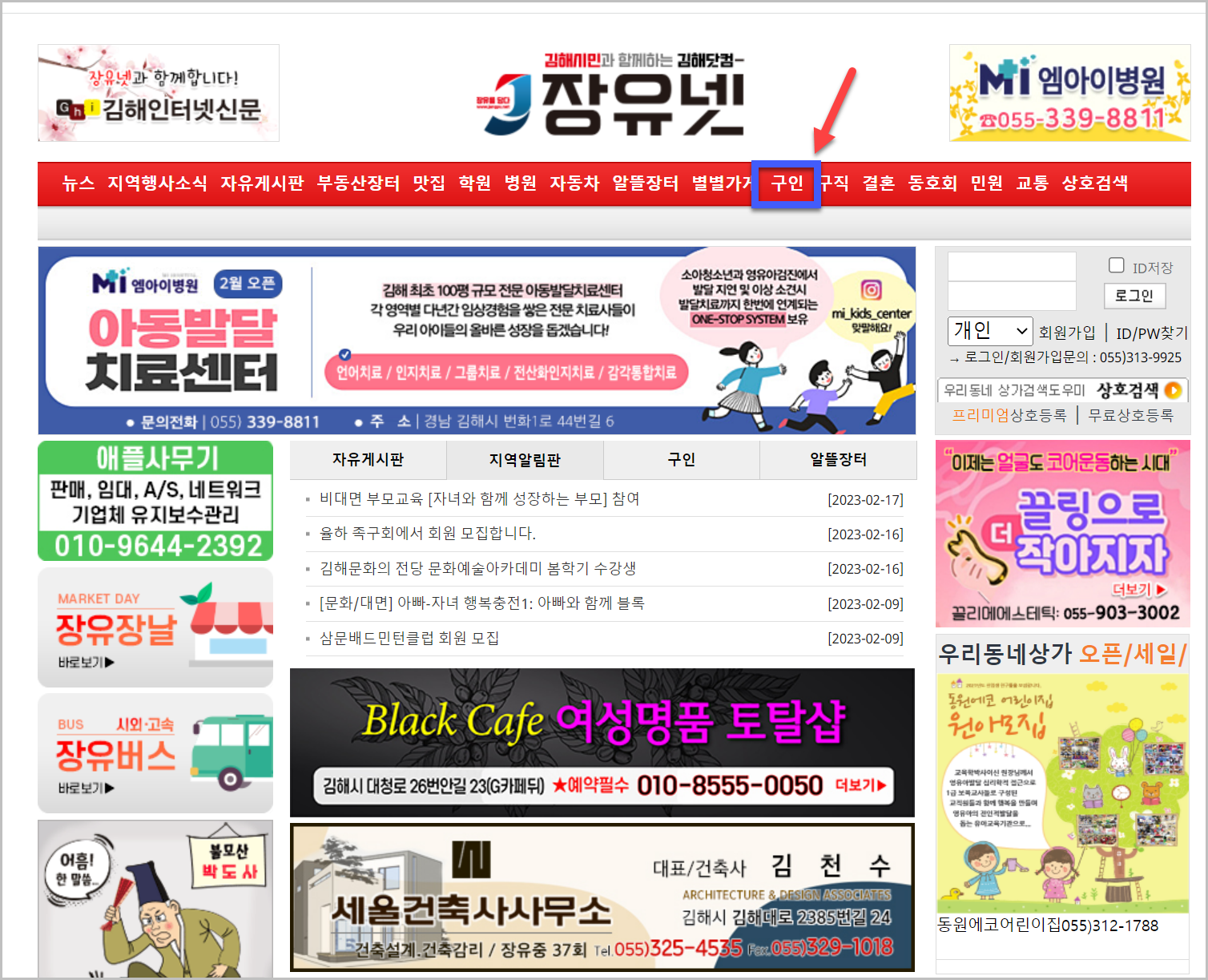 이러한 화면에서 오른쪽 메뉴를 보면 '구인'이라고 되어 있는 메뉴를 확인할 수 있습니다. 이곳에는 장유지역의 여러 일자리 정보들을 모아놓는 곳이라고 생각하시면 됩니다.