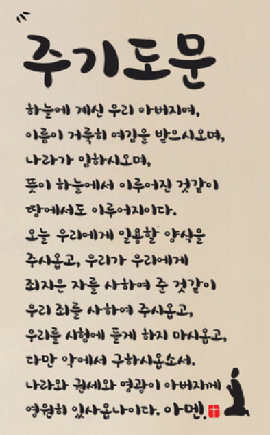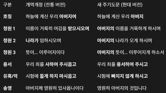 - 개역개정 주기도문: 100년 가까이 사용해 온 전통적인 문어체 번역입니다. 장엄하고 익숙하지만, "나라이", "받으시오며" 등 현대에는 잘 쓰지 않는 고어체가 많습니다.