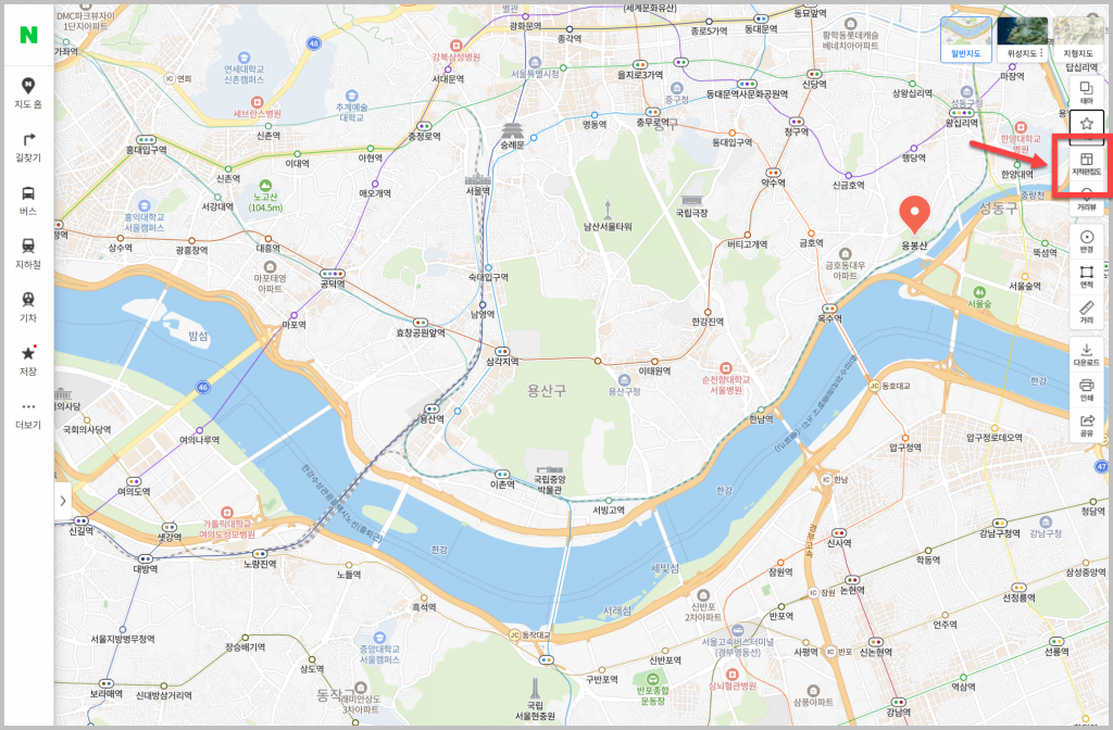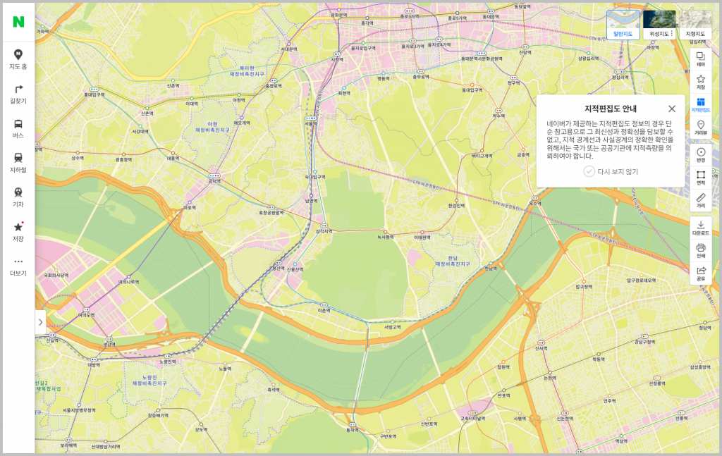 위 링크를 통해 네이버맵에 들어갈 수 있습니다. 들어가면 위와 같은 화면을 볼 수 있습니다. 오른쪽 메뉴에서 지적편집도를 클릭하면 해당 지도를 볼 수 있습니다.