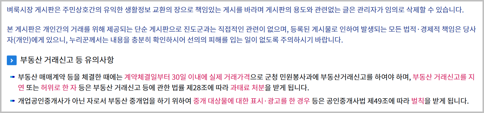 이 서비스를 이용할 때에는 몇 가지 주의할 점이 있습니다. 게시판에 올라온 정보는 군청이 직접 확인하거나 보장해주는 내용이 아니므로, 이용자가 스스로 사실 여부를 반드시 확인해야 합니다. 글 내용과 실제가 다르더라도 군청 측에 항의하거나 책임을 묻는 것은 의미가 없습니다.