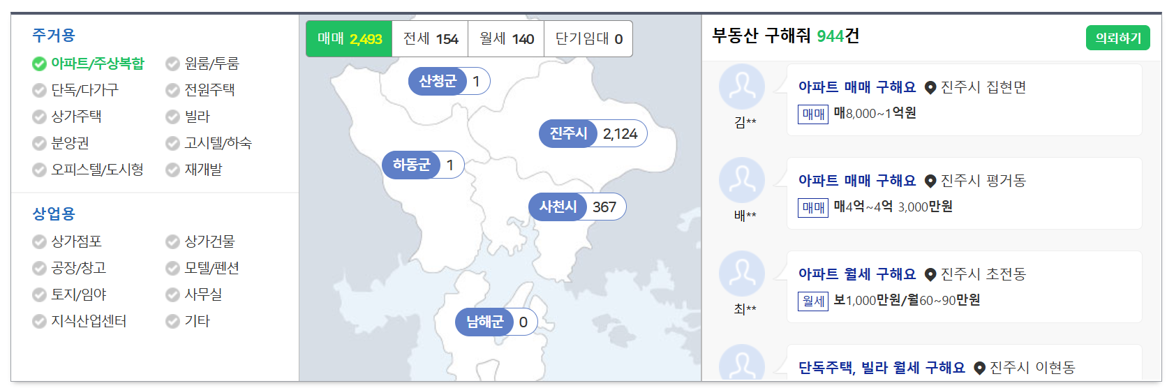 현재 진주시 매물 정보는 약 2,100건, 사천시 매물 데이터는 약 400건 정도 등록되어 있습니다. 진주와 사천은 지리적으로 매우 밀접하여 같은 플랫폼에서 함께 소개되는 것으로 보입니다. 사이트 구성은 과거 네이버 부동산과 유사한 형태로 되어 있으며, 지도 기반의 정보 제공 방식은 많은 사용자들이 선호하는 부분이기도 합니다.
