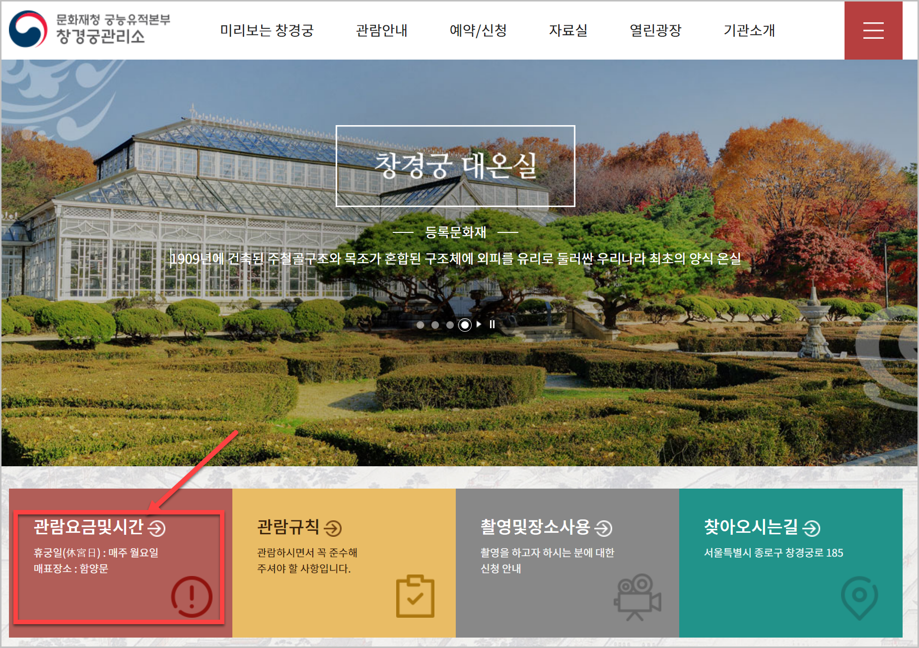 이런 화면이 나오면 왼쪽 아래를 보시면 창경궁 입장료를 확인할수 있는 아이콘이 있습니다. 이곳에 들어가면 언제 관람이 가능한지 요금이 어느정도인지 확인을 할 수있습니다.