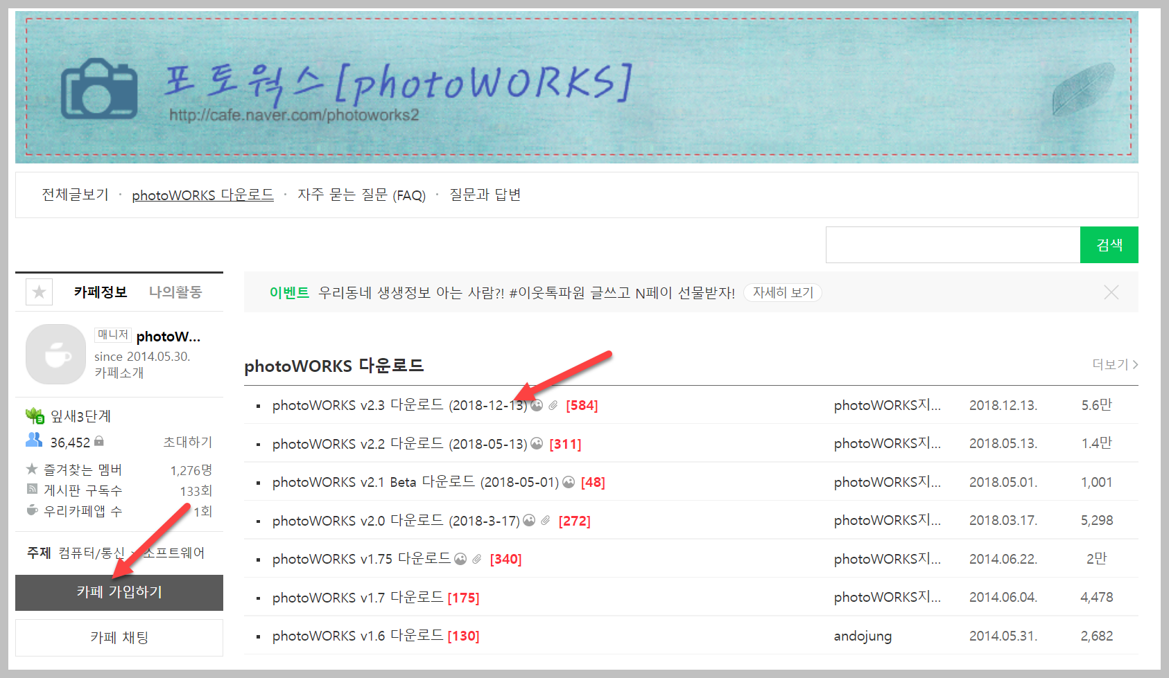포토웍스는 과거에는 홈페이지를 통해서 배포했던 적도 있었던것 같습니다. 하지만 홈페이지 같은것은 운영비가 별도로 필요하기 때문에, 개발자분이 네이버 카페에서 배포를 하고 있습니다.