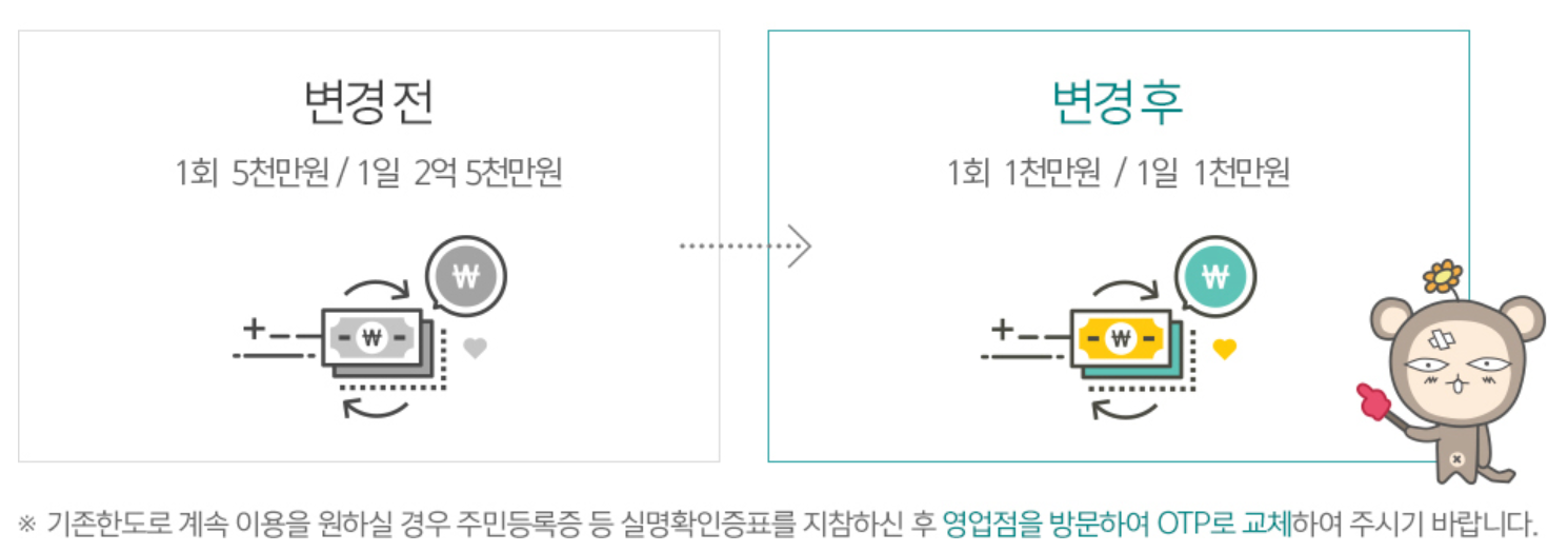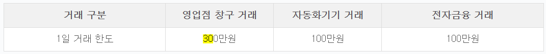 - 1일 제한 : 100만원 (영업점은 300까지 됨)