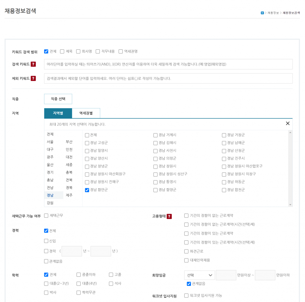 이곳에서 가장 중요한 항목 중 하나는 채용 정보일 것입니다. 위 화면과 같이 채용정보를 클릭하면 다양한 필터링 기능들이 나옵니다. 필터링 기능을 통해 본인에게 적합한 채용공고를 확인 할 수 있습니다. 또한 이러한 지자체의 일자리 센터들은 대부분 고용노동부 워크넷(Worknet)과 연동이 되어있어, 제공하는 정보가 거의 동일합니다. 그래서 검색이나 필터링 시스템도 워크넷과 비슷하다는 느낌을 받을 수 있습니다.