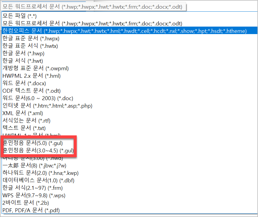 한컴오피스에서 파일 열기를 하면 훈민정음 문서 3.0에서부터 5.0 까지 이용할수 있는것으로 되어 있습니다. 그 뿐만아니라 굉장히 다양한 확장자를 이용할수 있음을 확인할수 있습니다.