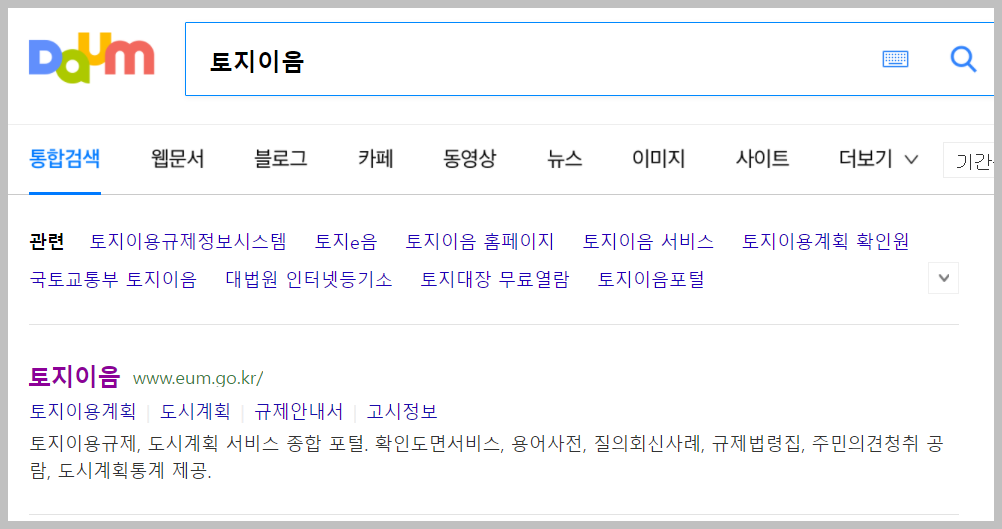 네이버에서 '토지이음'을 검색하면 위와 같은 화면을 볼 수 있으며, 다음에서도 비슷한 결과를 얻을 수 있습니다. 편리한 방법으로 이용할 수 있습니다.