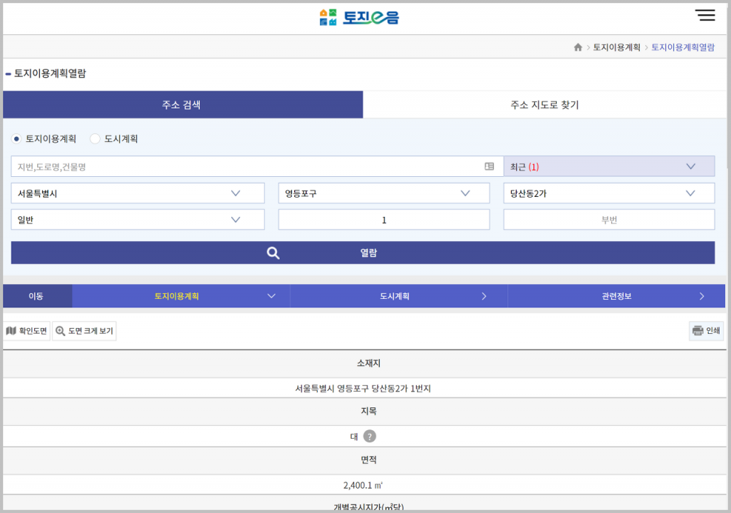 제가 테스트해본 예시 중 하나는 '영등포구 당산동2가 1번지'입니다. 위와 같이 해당 지역의 지구 등 여러 내용을 확인할 수 있으며, 다양한 규제 사항도 쉽게 확인할 수 있습니다. 땅를 구매한 후 다양한 규제 사항을 확인하는 것은 필수적인 단계라고 할 수 있습니다.