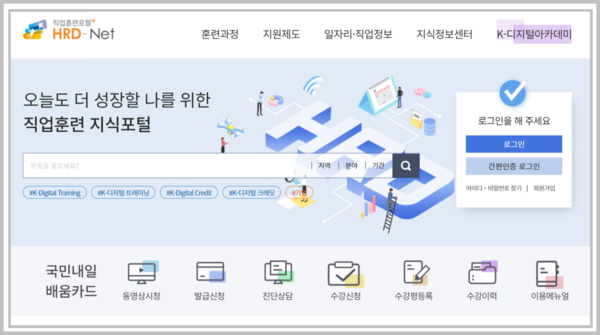 고용노동부 하드넷은 대한민국 공식 전자정부 웹사이트로, 취업준비를 위한 수강비를 지원받을 수 있는 국민 내일 배움카드를 발급받을 수 있는 곳뿐만 아니라, 국비로 지원되는 학원을 찾거나 직업과 관련된 다양한 내용을 찾아볼 수 있는 곳입니다.