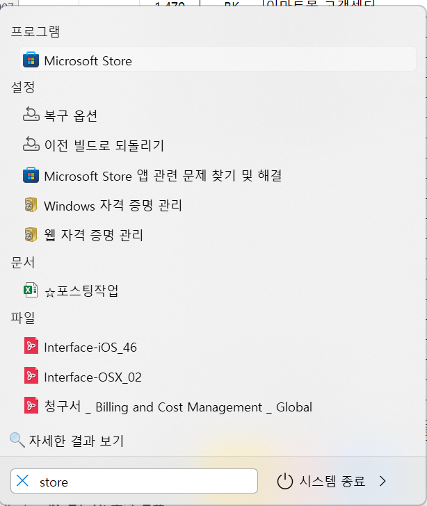 1.윈도우 키를 누르고 검색창에 ‘store’를 입력하여 마이크로소프트 스토어를 실행합니다.