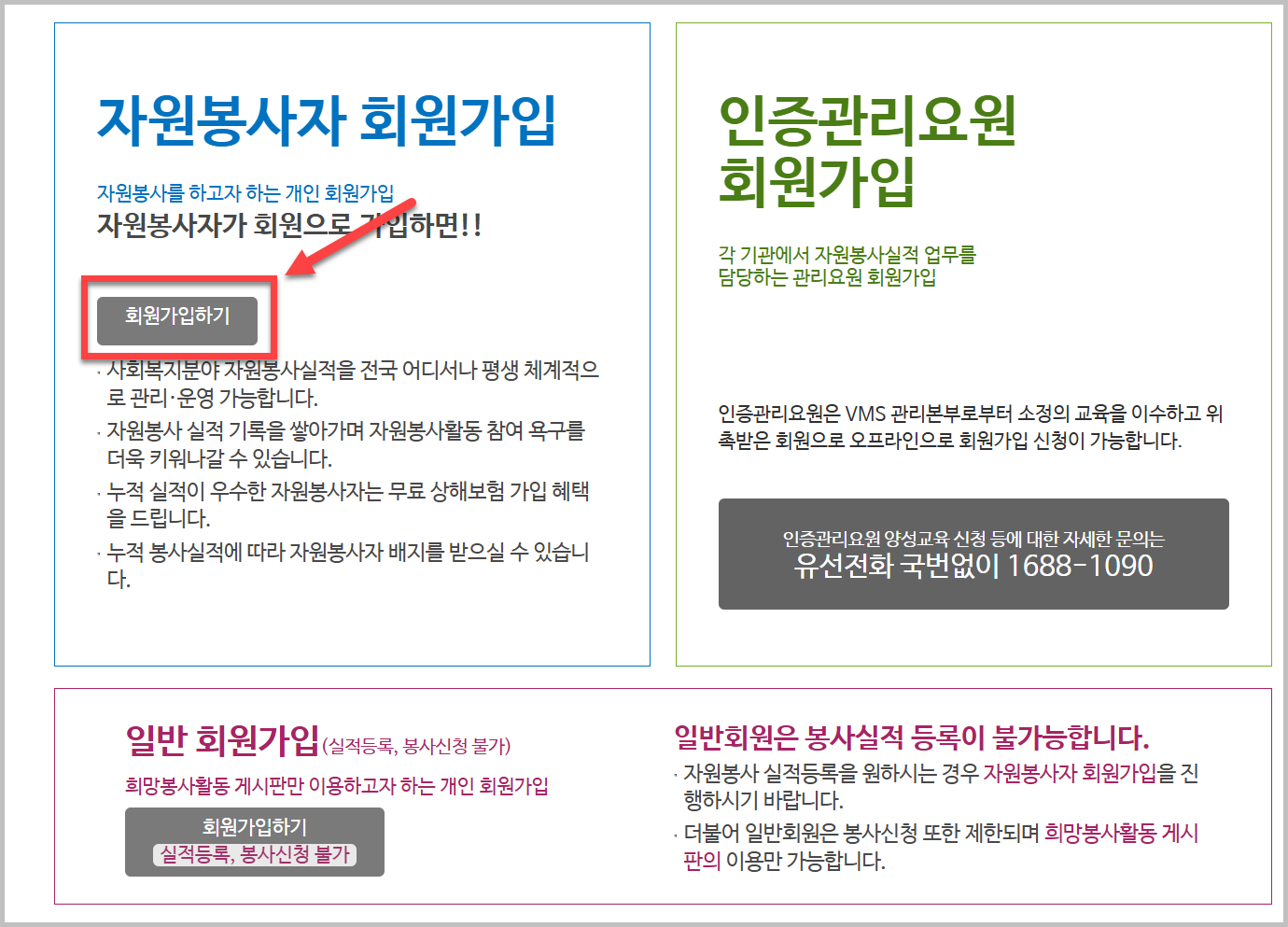 이 세가지가 있는데 일반회원가입의 경우에는 실적등록이나 봉사신청을 할수가 없습니다. 그렇기 때문에 일반적으로 이 사이트를 이용하려는 사람이라면 자원봉사자로 들어가는것이 옳습니다. 공식홈페이지 들어가기 로 들어가시면 편리하게 이용을 할수가 있습니다.